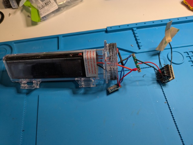 With everything apart, I cut the existing circuit board from the batter and solar panels. I realized pretty quickly that the wires from the solar panel and battery were going to be to big to solder to the controllers, so I tracked down some smaller wire that I could use, and then I would join it to the existing wires.